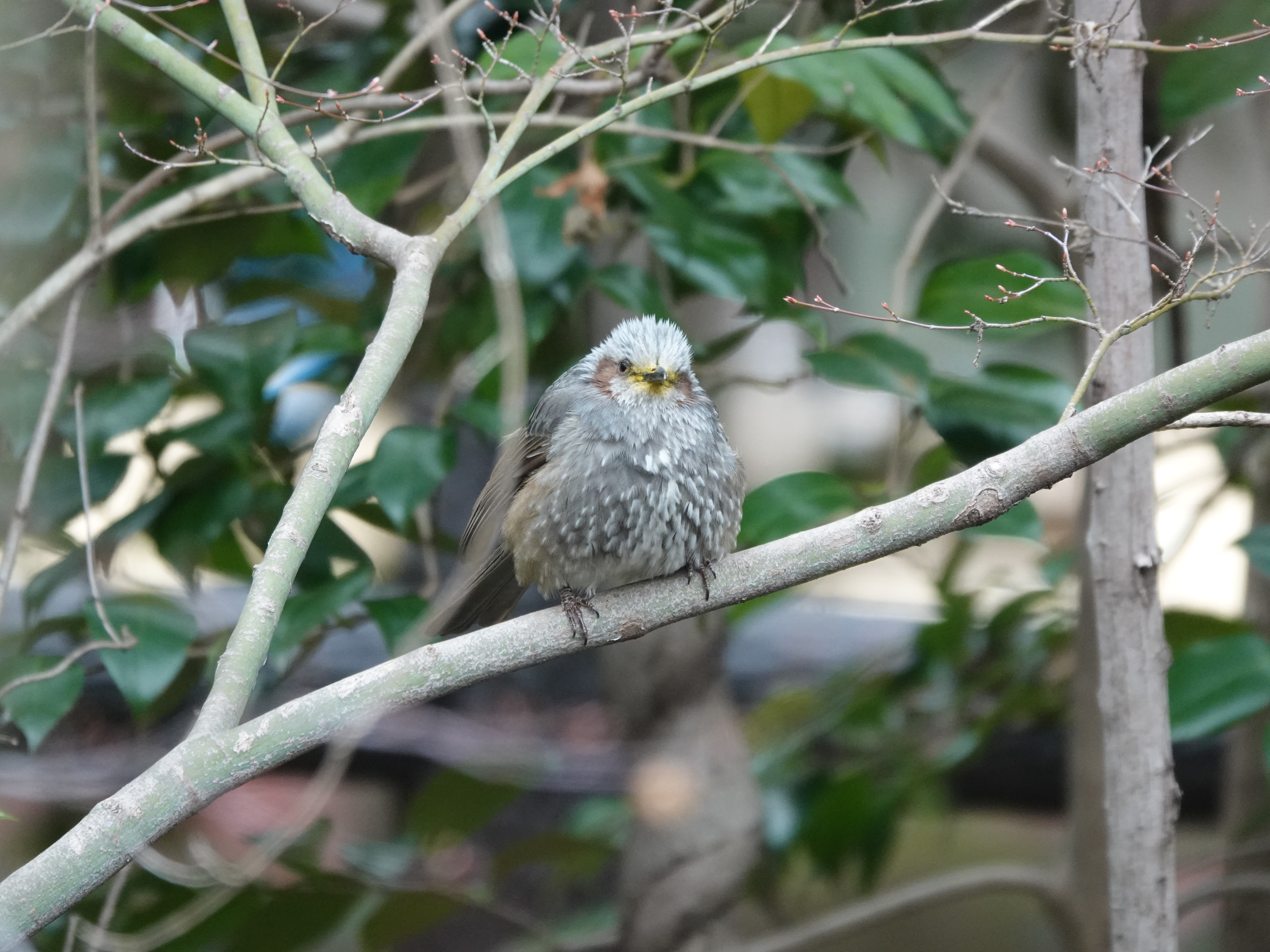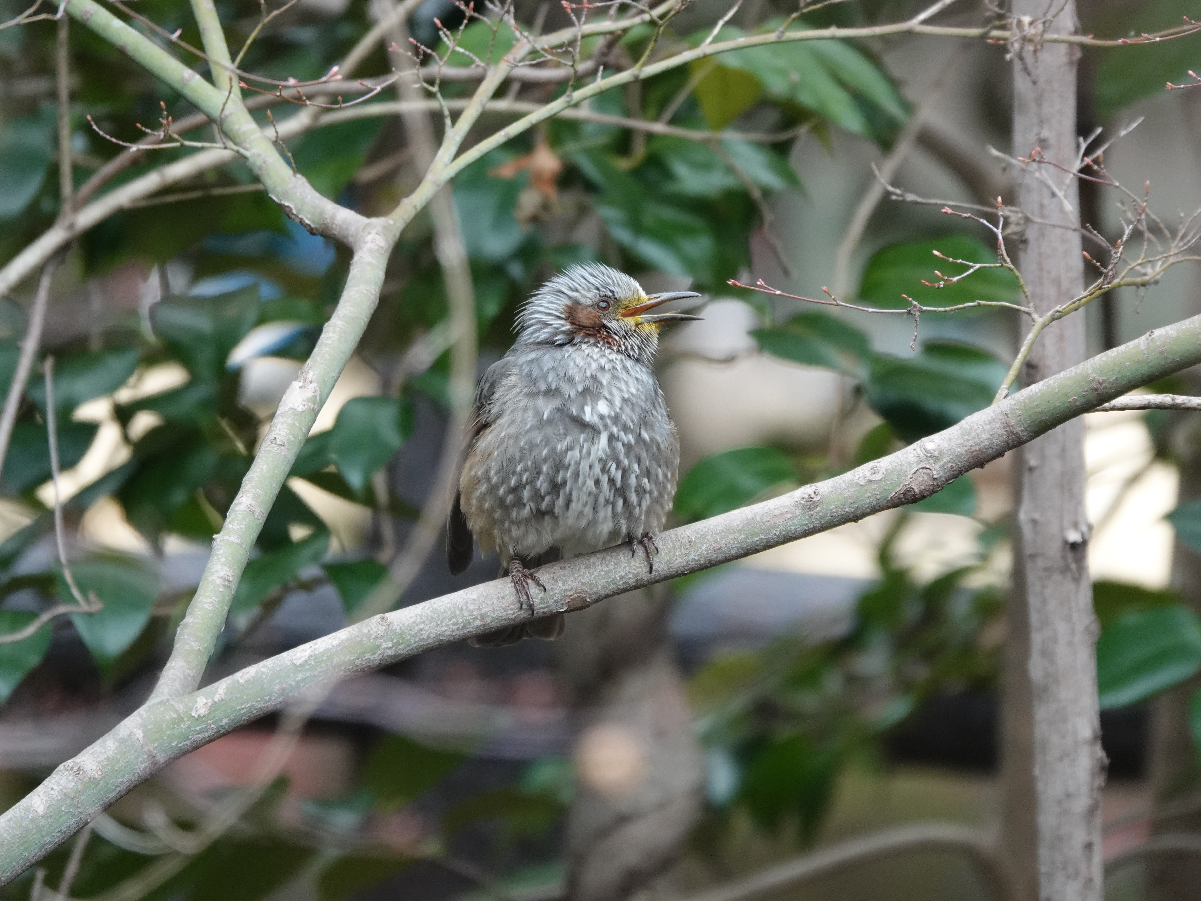 One day on my way to the park, I heard a weird squeaking sound and a silhouette of a bulbul-looking bird appeared on a wood-like plastic fence. As I approached, the bird flew to an inner branch.