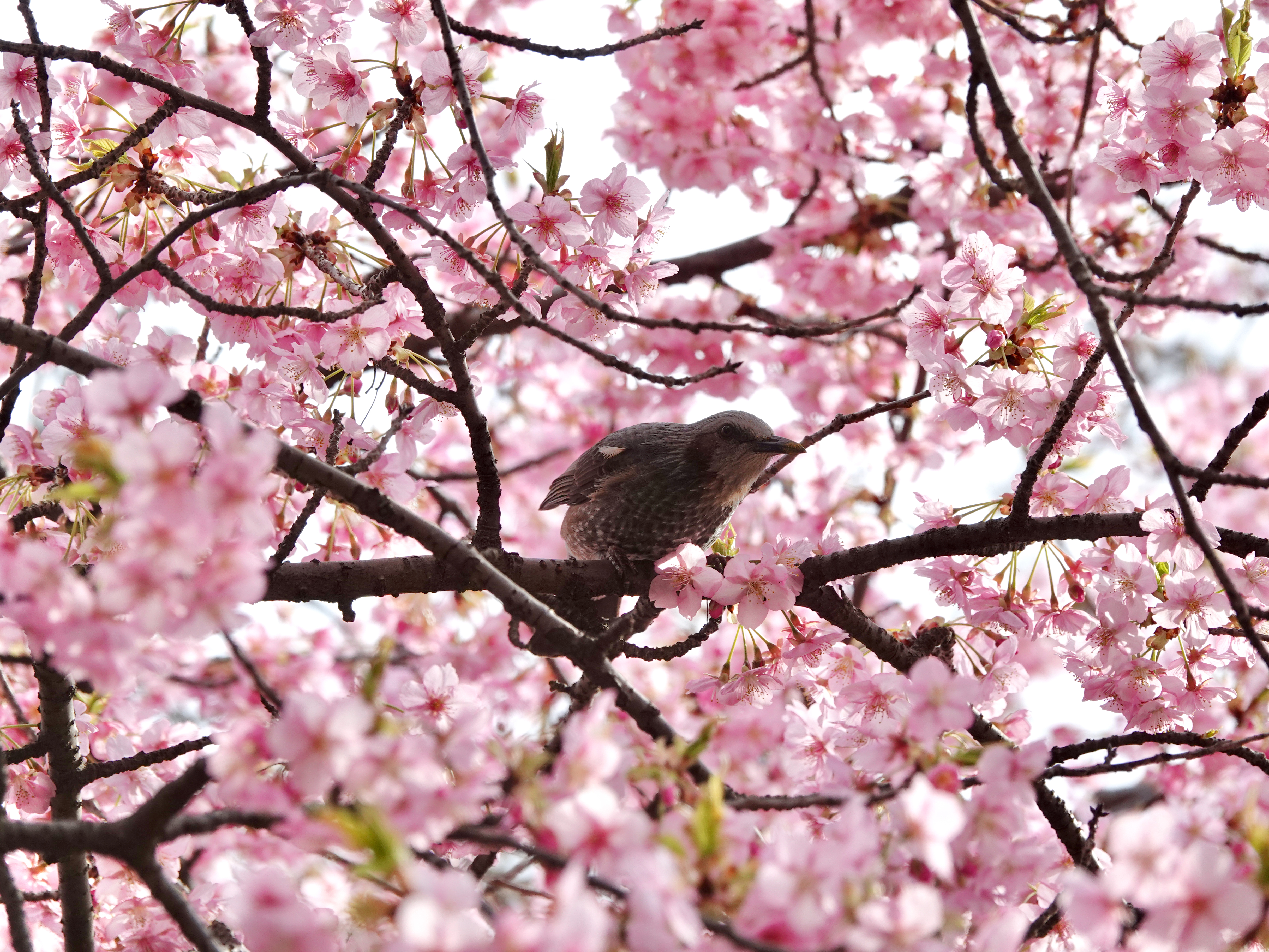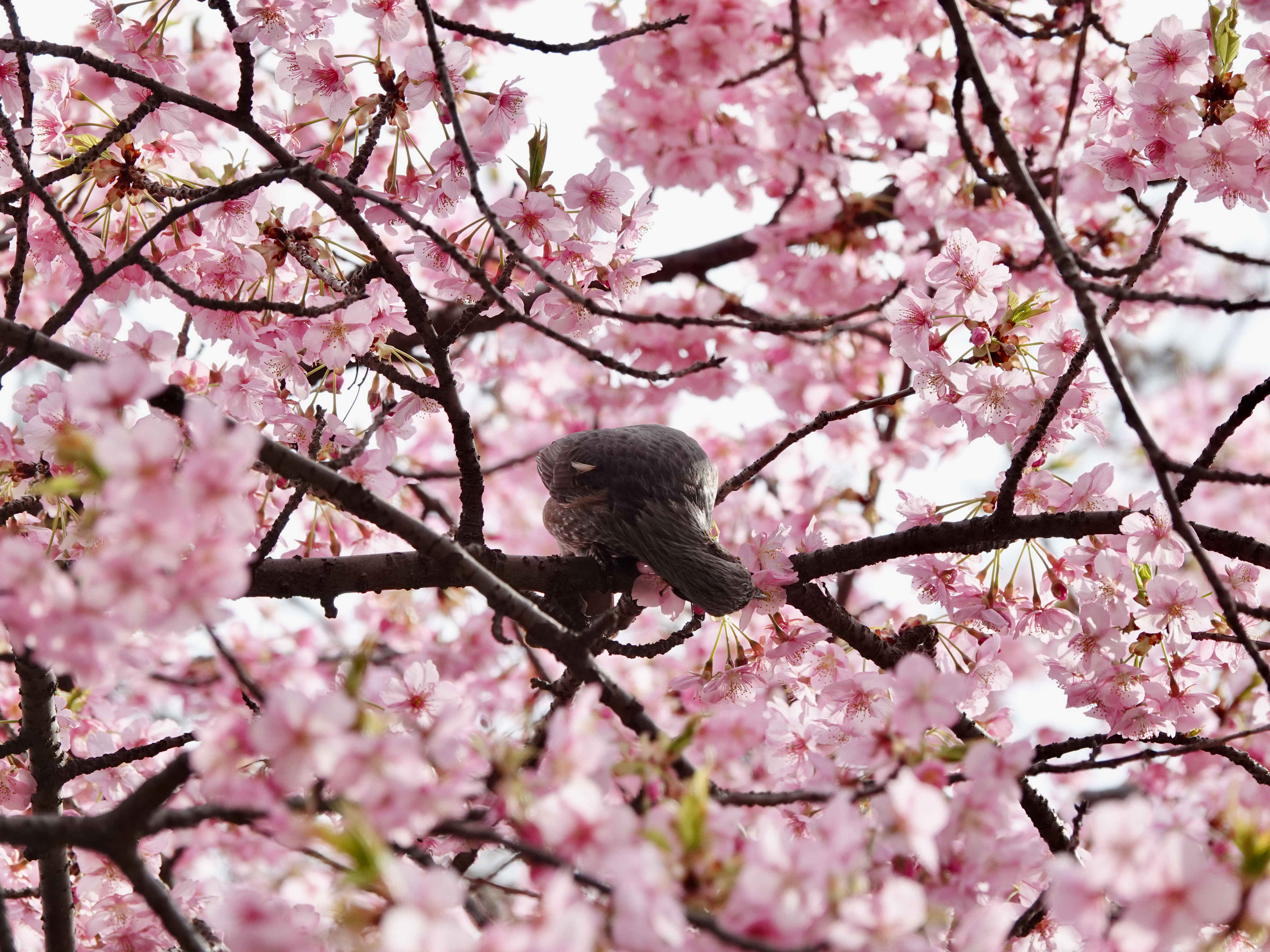 I stood under an early blossoming sakura tree, somehow pink petals kept falling from above even though the wind was not blowing. I spent some time looking and found the culprit behind these falling fresh pink petals.