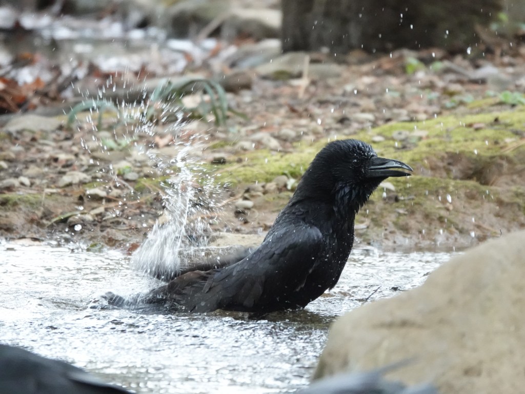 I kept walking towards the park, until I arrived at the “Bird Sanctuary”(小鳥の森). The sanctuary was quiet as usual, there were a couple of Eastern Spot-Billed Ducks at this small pond when I visited last time. This time, however, the pond was occupied by some Large-billed Crows this time. The way they were enjoying the bath caught my attention, as they were just seemed like huge dogs for a moment.