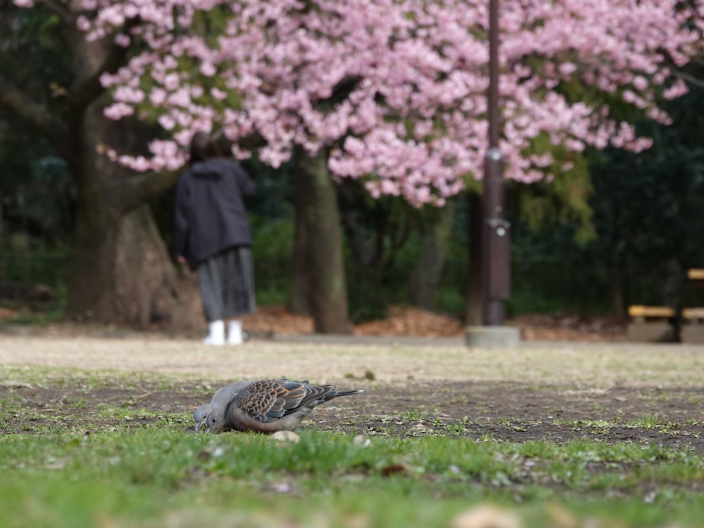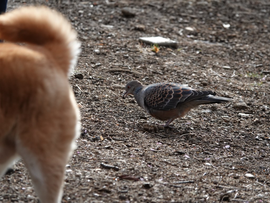 Arriving at the west side of the park, a large field was divided into many patches by the walking (& cycling) paths. Two Oriental Turtle Doves were foraging on ground, even with a curious and playful Shiba dog nearby. Was it a sense of security, confidence in its agility or simply not thinking anything at all ?